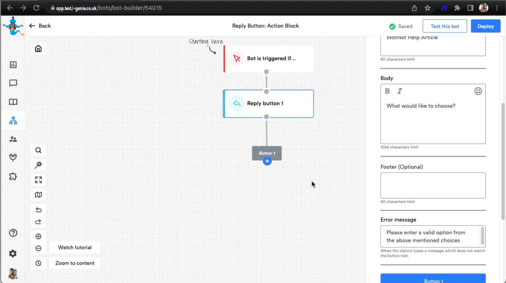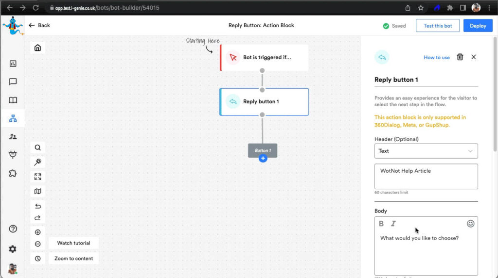 Lastly, like in the buttons action block, you would add the list of buttons and its button text (which is limited to 3 in WhatsApp) and the error message associated with it.