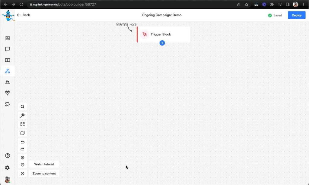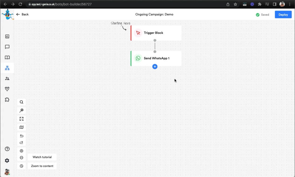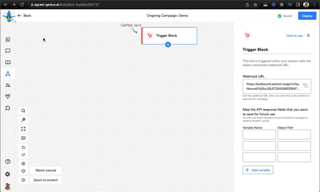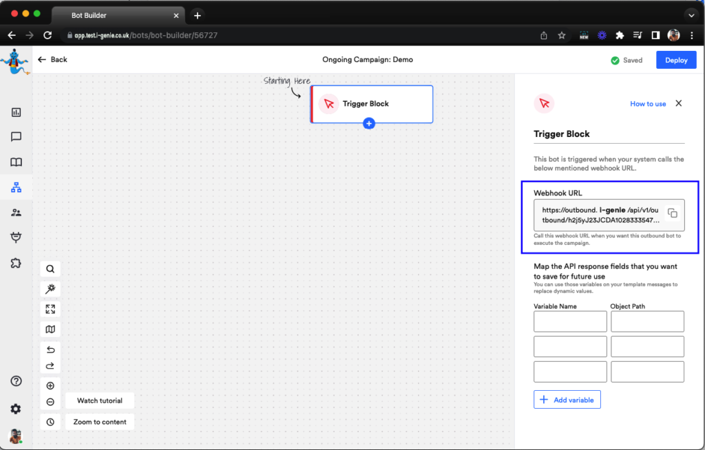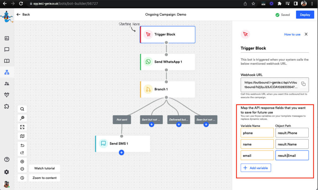 In order to successfully send the messages to your contacts, first you need to save the contacts on i-genie. We do that by saving the response received on the web-hook into variables on the ‘Trigger’ action block.