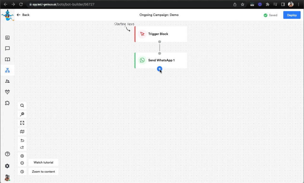 Add ‘Send WhatsApp’ or ‘Send SMS’ action block on canvas by clicking on ‘+’